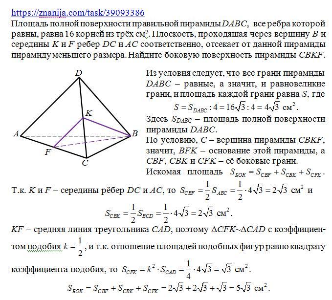 Площадь полной поверхности правильной пирамиды DABC, все ребра которой равны, равна 16 корней из трёх см2. Плоскость, проходящая через вершину В и середины Ки Fребер DСи АС соответственно, отсекает от данной пирамиды пирамиду меньшего размера. Найдите боковую поверхность пирамиды СВКF.