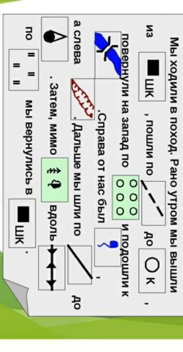 Мы ходили в поход. Рано утром мы вышли из школы, пошли по тропинке до колодца, повернули на запод по фруктовому саду, и пошли к мосту. Справо от нас был родник, а слево овраг. Дальше мы шли по грунтовой дороге до башни, затем мимо смешанного леса в доль линии водораздела, по лугам мА вернулись в школу.
