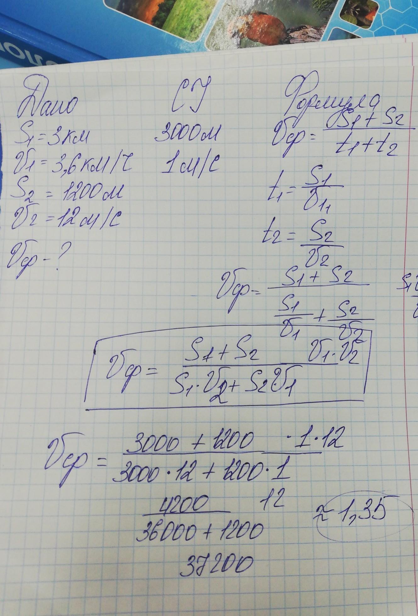 Поднимаясь в гору, лыжник проходит путь, равный 3 км, со скоростью 3,6 км/ч. Спускаясь с горы со скоростью 12 м/с, он проходит 1200 м пути. Определите среднюю скорость лыжника на всем пути.