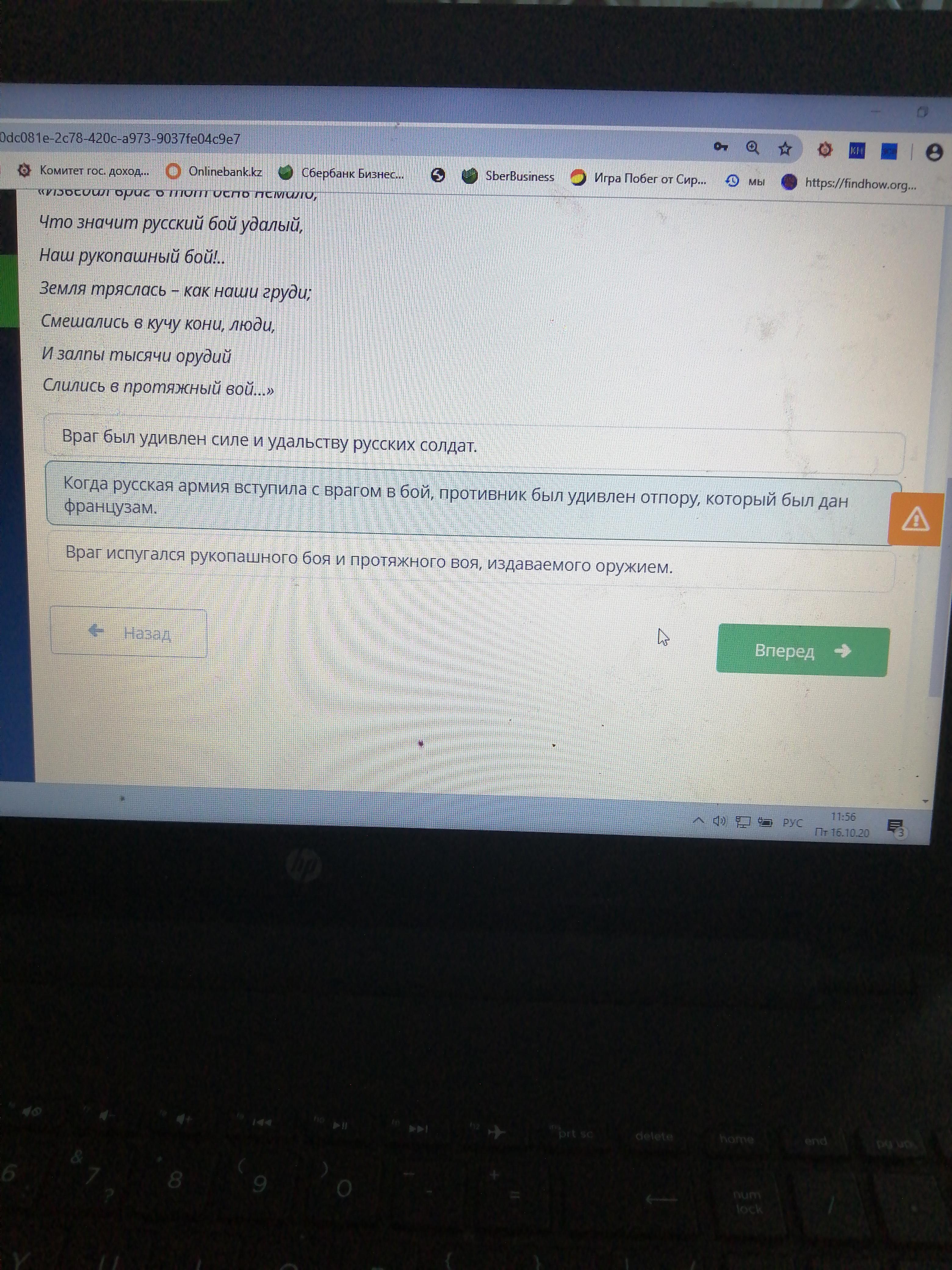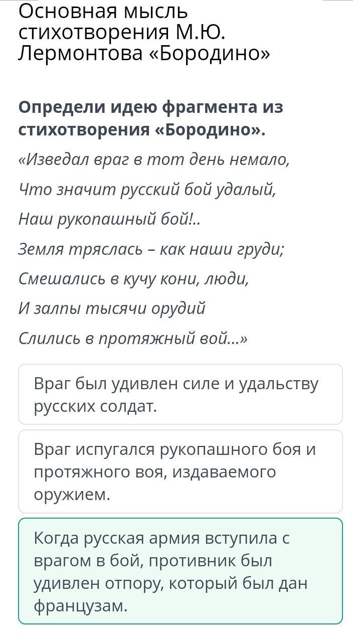 Определи идею фрагмента из стихотворения «Бородино». «Изведал враг в тот день немало, Что значит русский бой удалый, Наш рукопашный бой!.. Земля тряслась – как наши груди; Смешались в кучу кони, люди, И залпы тысячи орудий Слились в протяжный вой...» Враг испугался рукопашного боя и протяжного воя, издаваемого оружием. Когда русская армия вступила с врагом в бой, противник был удивлен отпору, который был дан французам. Враг был удивлен силе и удальству русских солдат.