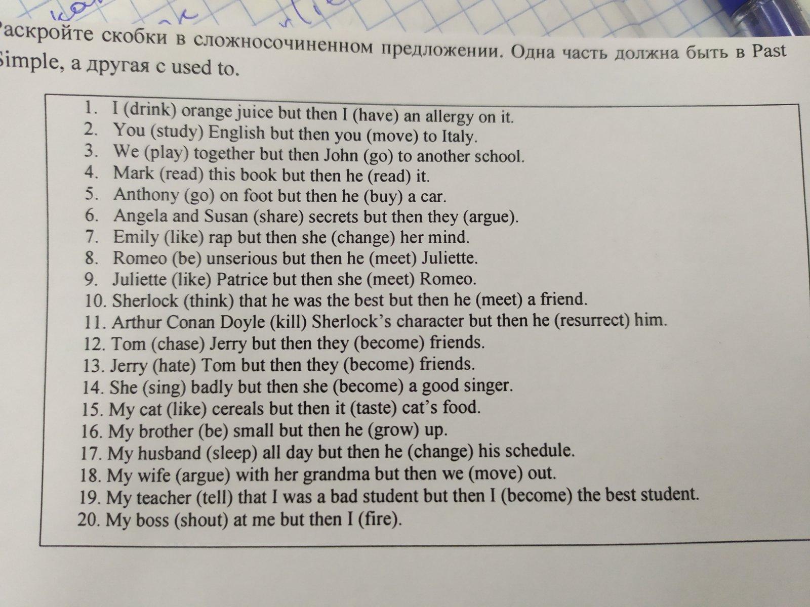 Раскройте скобки в сложносочинённом предложении. Одна часть должна быть в Past Simple а вторая с used to