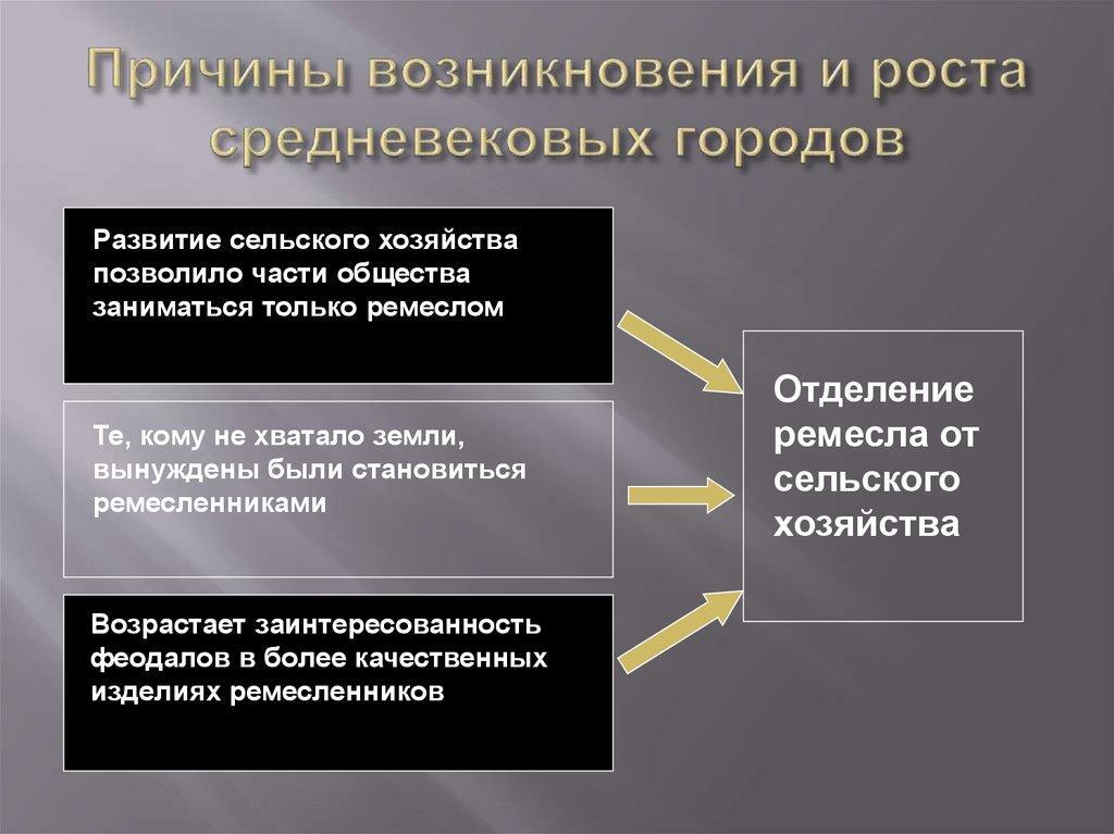Причины возникновения городов в средневековых странах можно объяснить тем, что была большая потребность в том, чтобы возникали новые административные центры. Нужно было более эффективно управлять большими территориями страны. Также свой след в создании городов отложило и развитие торговли. А еще многие города были такими себе военными центрами и служили в качестве защиты монархов и представителей знати