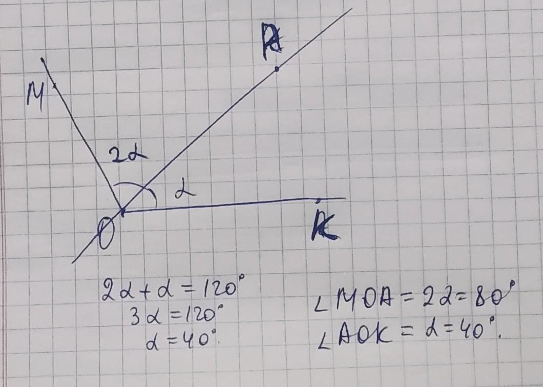 Угол МОК ,равный 120 ,разделен лучом ОА на два угла,ГРадусная мера угла МОА в 2 раза больше градусной меры угла АОК. Вычислите градусные меры этих углов . ЧЕРЕЗ ДАНО