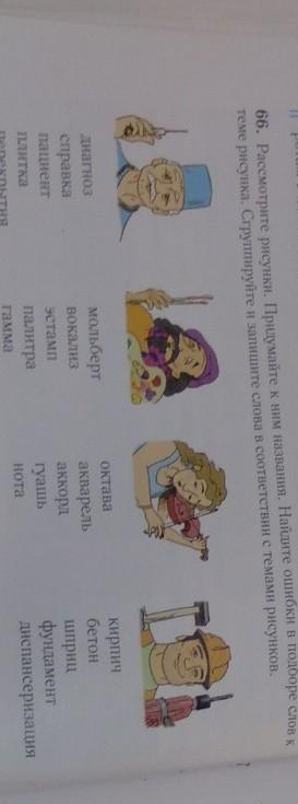 66.Расмотрите рисунки придумайте к ним названия Найдите ошибкив прбробе слов к теме рисунка Сгруппирувийте и запишите слова в соответствии с темами рисунков
