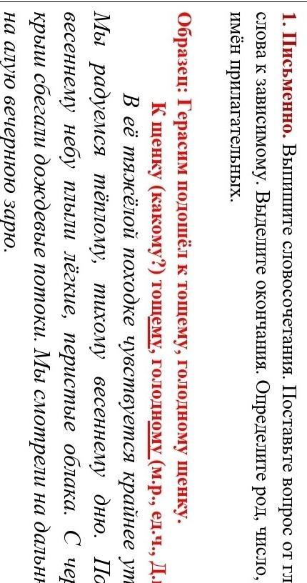 . Письменно. Выпишите словосочетания. Поставьте вопрос от главного слова к зависимому. Выделите окончания. Определите род, число, падеж имён прилагательных.