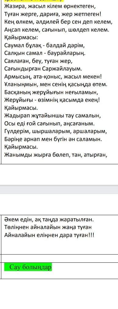 Жазира, украшенная зеленым ковром, Родина, река, земли мало! Я тоскую по тебе, я тоскую, я скучаю по тебе, я хочу пить. Припев: Источник Саумаль - медовое лекарство, Холодный ветер - | - ваши склоны. Тень, танец, Родина, Пропущенный Саржайлау. Твоя армия, твой дед - поселок, зеленое место! Я пройду мимо тебя. Зачем мне быть чужим Жеруйык, Жеруйык со мной! Хор. Я скучаю по горному бризу, очень скучаю по нему. Мои цветы, мои елки, мои можжевельники, я пою для вас сегодня. Хор. Моя душа была наполнена песней, я был поражен, я был Отцом, я был создан утром. Я родился от твоего отпрыска, родился на твоей родине !!! Будь здоров