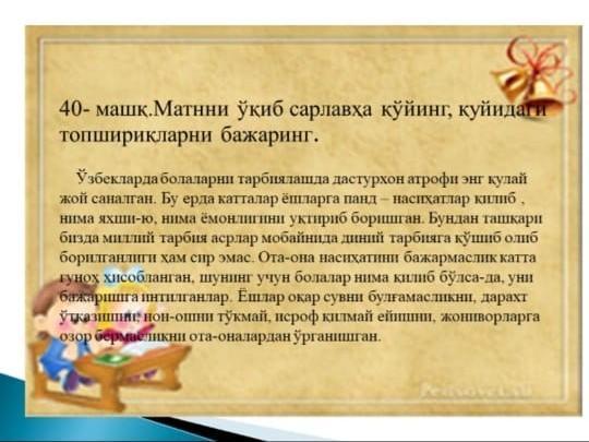 Ответ:Узбеклар болаларга жуда яхши тарбия беришади. Купрок улар кийиниш одоби, овкатланиш одоби ва сузлашиш одобига ахамият беришади. Овкатланганда аввал катталар бошлаши керак. Бирор кийим кийганда узун кийим кийиш, сузлашганда еса шошмасдан, чиройли, тарбия билан гаплашиш керак