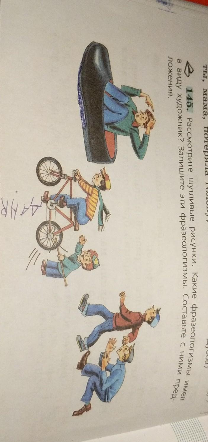 145. Рассмотрите шутливые рисунки. Какие фразеологизмы имел в виду художник? составьте. с ними предложения, помогите 5 балов дам