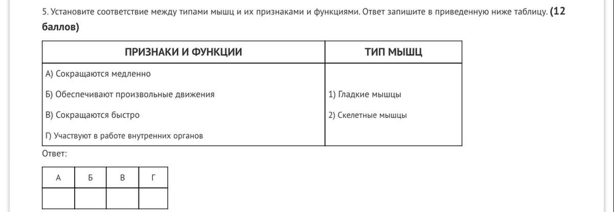 Установите соответствие между типами мышц и их признаками и функциями. Ответ запишите в приведенную ниже таблицу. (12 баллов)