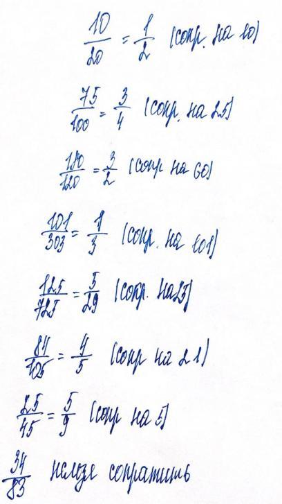 Сократите дроби: 10/20 75/100 180/120 101/303 125/725 84/105 25/45 34/83 Пожалуйста очень надо. Заранее спасибо большое!