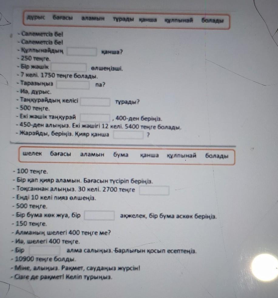 Ответ:құлпынайдың бағасы қанша?,екі жәшік таңқурай аламын,400-ден берініз.қияр қанша тұрпды?.бір шелек алма салыныз.