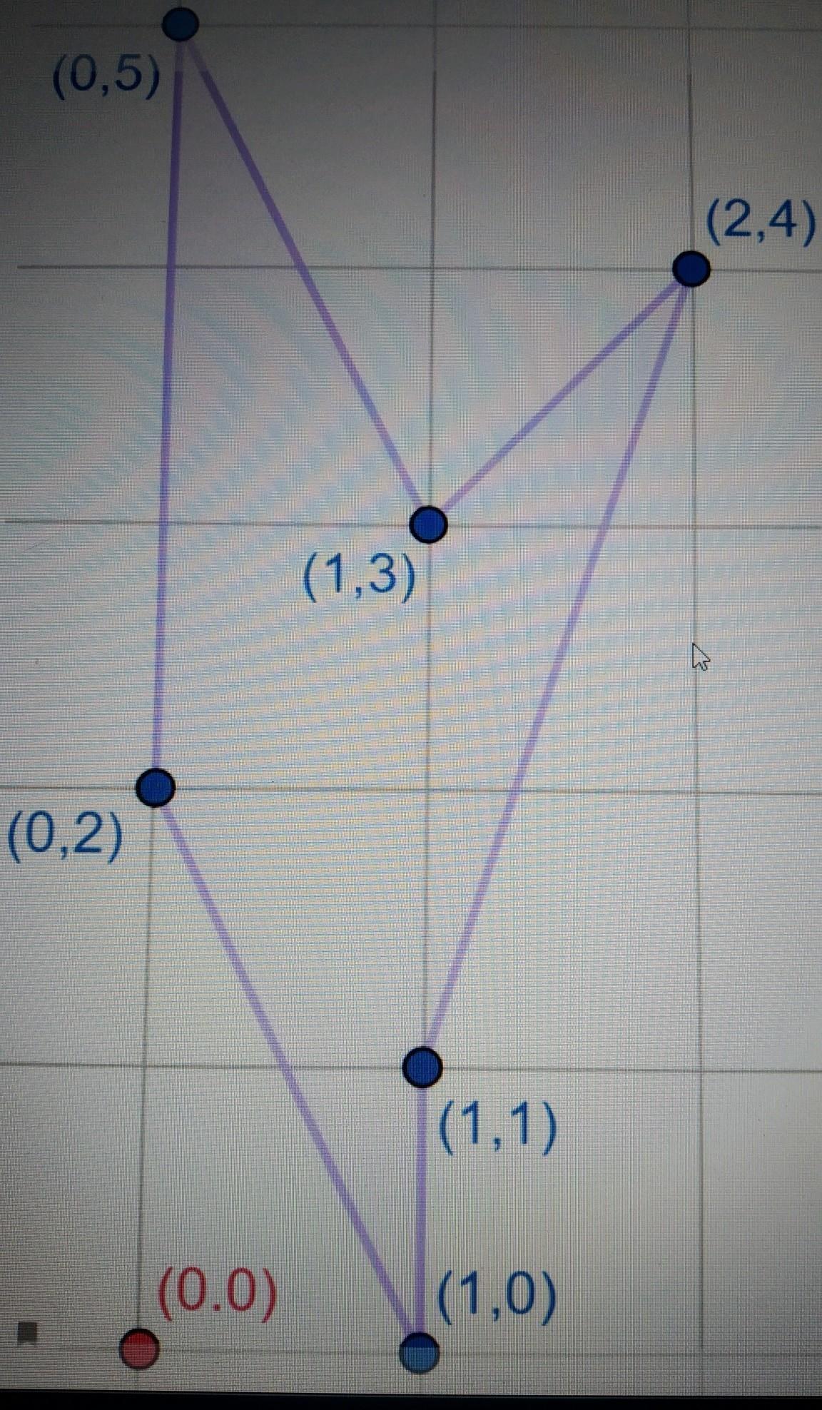 Точки (1,0), (1,1), (2,4), (1,3), (0,5), (0,2) на координатной плоскости последовательно