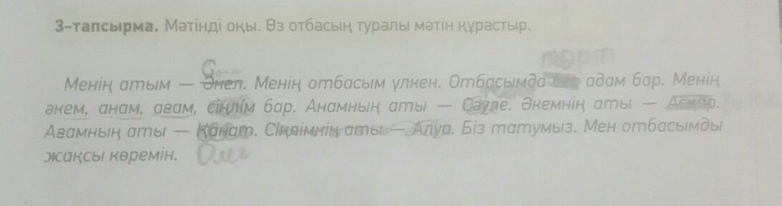 Менің атым - (пишешь сюда свое имя). Менің отбасым үлкен. Отбасымда төрт адам бар. Менің әкем, анам, ағам бар. Анамның аты - (пишешь имя своей мамы). Әкемнің аты - (вставляешь имя твоего отца). Ағамның аты - (имя твоего брата). Біз татумыз. Мен отбасымды жақсы көремін.