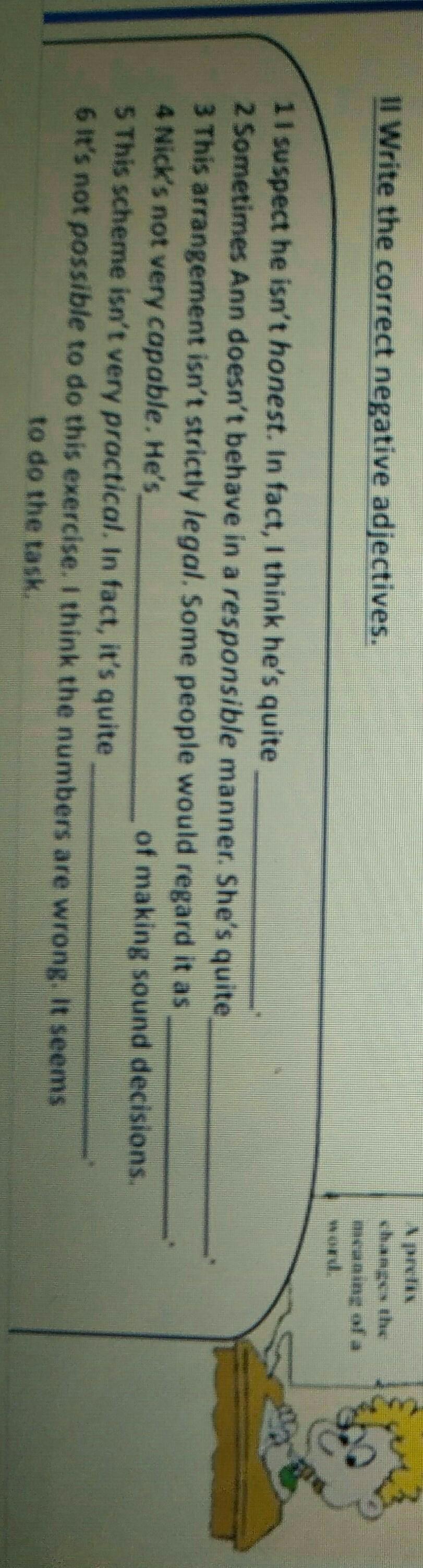 1. dishonest 2. irresponsible 3. illegal 4. uncapable 5. impractical 6. impossible
