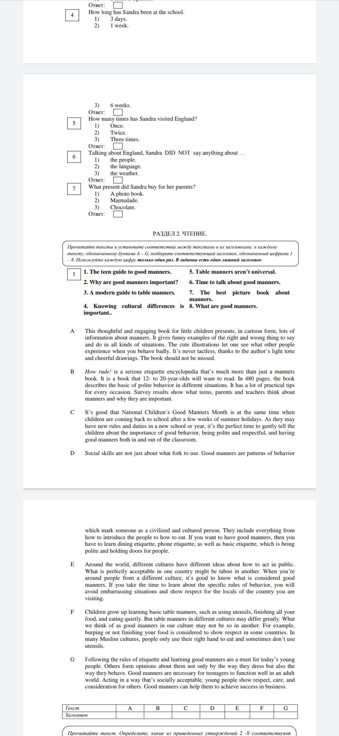 тексту, обозначенному буквами A – G, подберите соответствующий заголовок, обозначенный цифрами 1