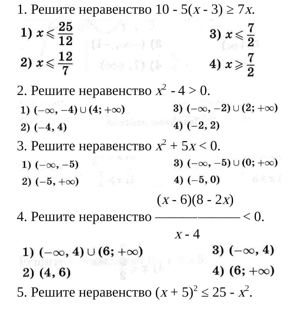 1. Решите неравенство 10 - 5(х - 3) ≥ 7х.