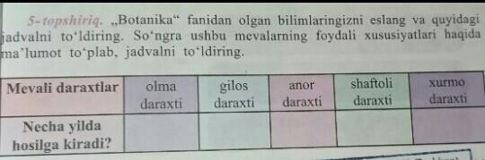 "Botanila" fanidan olgan bilimlaringizni eslab 5-topshiriqdagi jadvalni to'ldiring.
