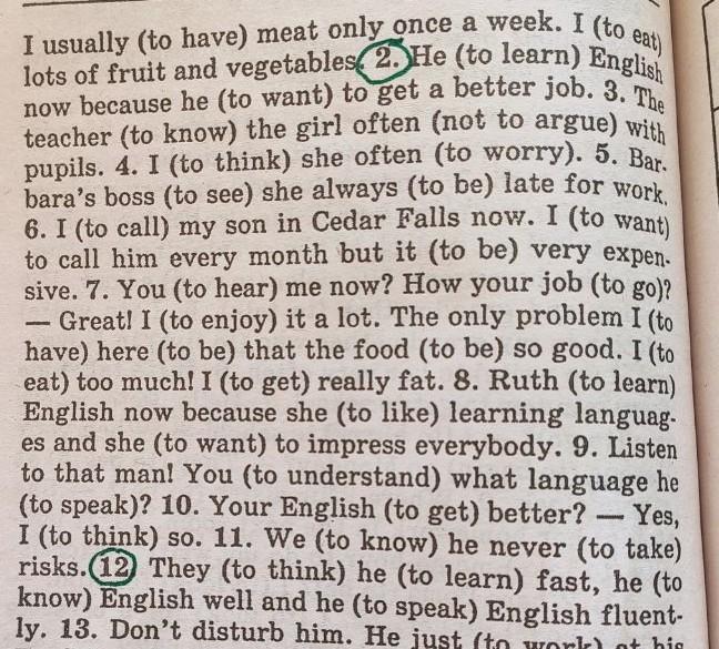 1) have, am eating. 2) is learning, wants. 3) knows, doesn`t argue. 4) think, worries. 5) see she is always late... (странное предложение. вроде is тут, но я не на 100% уверенна) 6) am calling, want, is. 7) do you hear me, how is your job going, enjoy, have, is, is. 8) is learning, likes, wants. 9) understand, he is speaking. 10) is getting, think. 11) know, takes. 12) think, is learning, knows, speaks.