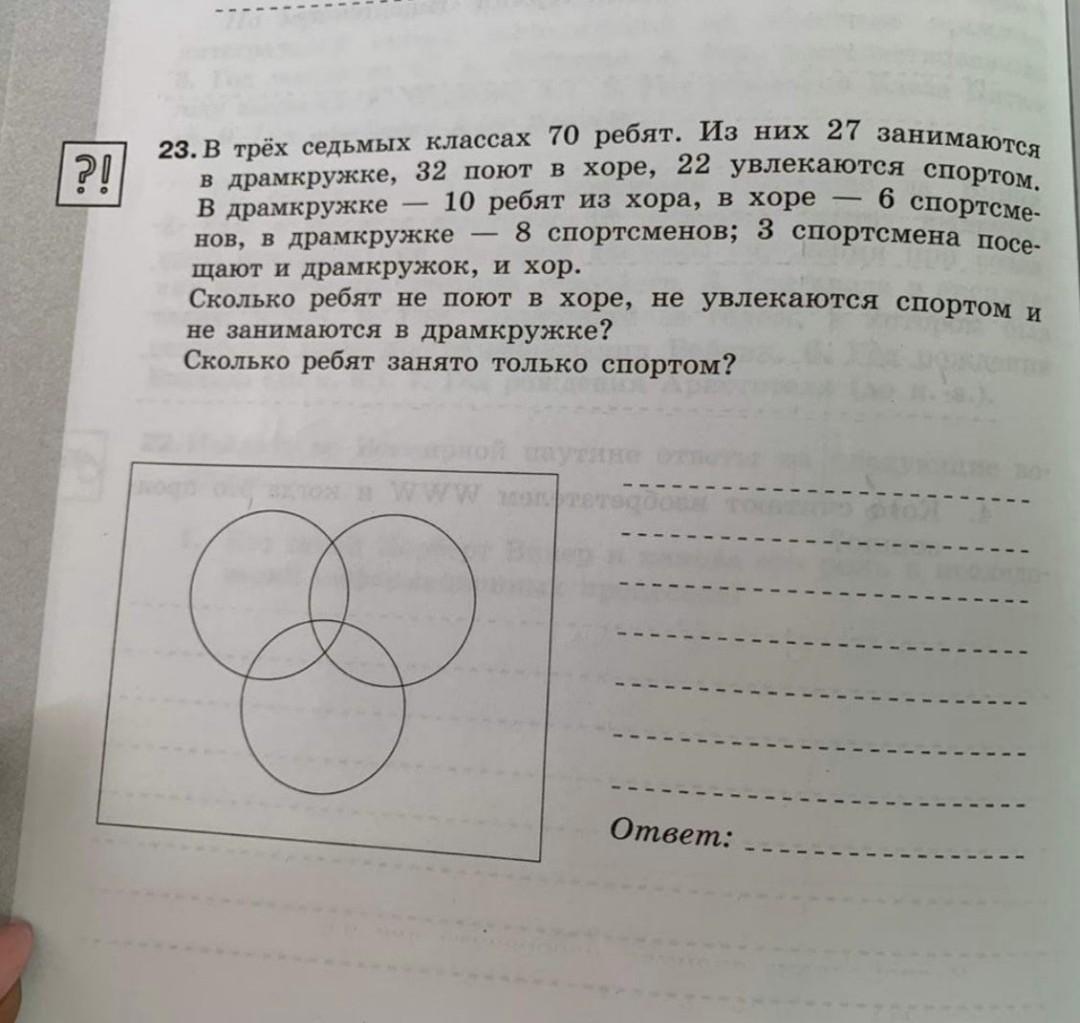 2) 10 учеников посещают и драмкружок и хор. В пересечении Драмкружка и Хора должна стоять число 10, но у нас еще идёт пересечение с областью(цифра 3). Из 10-ти вычитаем 3 и получим число 7. Таким образом 7-ро учеников ходят в драмкружок и хор, но не увлечены спортом.