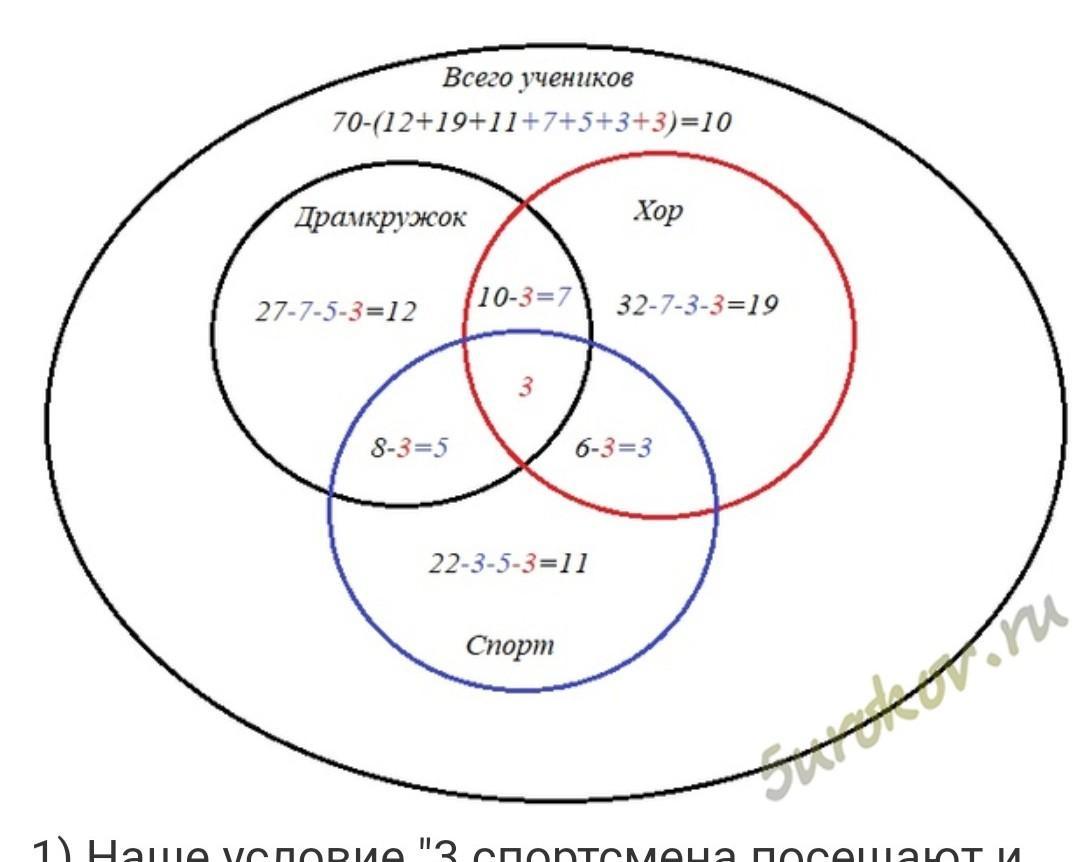 1) Наше условие "3 спортсмена посещают и драм кружок и хор" соответствует красной цифре 3 на картинке.