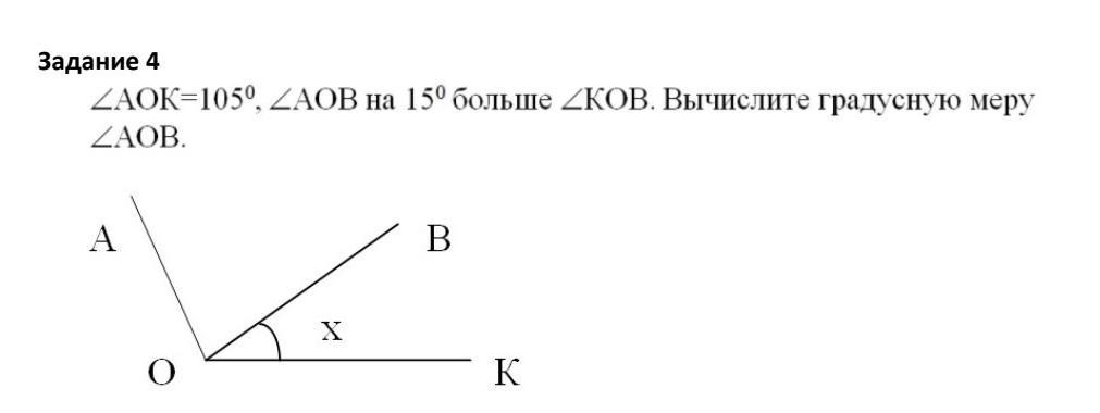 АОК=105°, АОВ=15°+КОВ, КОВ=х