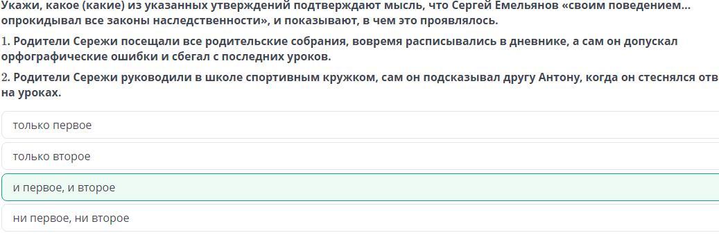 Укажи, какое (какие) из указанных утверждений подтверждают мысль, что Сергей Емельянов «своим поведением… опрокидывал все законы наследственности», и показывают, в чем это проявлялось. 1. Родители Сережи посещали все родительские собрания, вовремя расписывались в дневнике, а сам он допускал орфографические ошибки и сбегал с последних уроков. 2. Родители Сережи руководили в школе спортивным кружком, сам он подсказывал другу Антону, когда он стеснялся отвечать на уроках. только первое только второе и первое, и второе ни первое, ни второе
