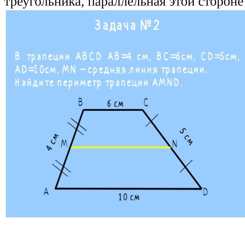 Средняя линия равна половине суммыоснованый. И делит боковые стороны пополам. 10+8+2+2.5=22.5