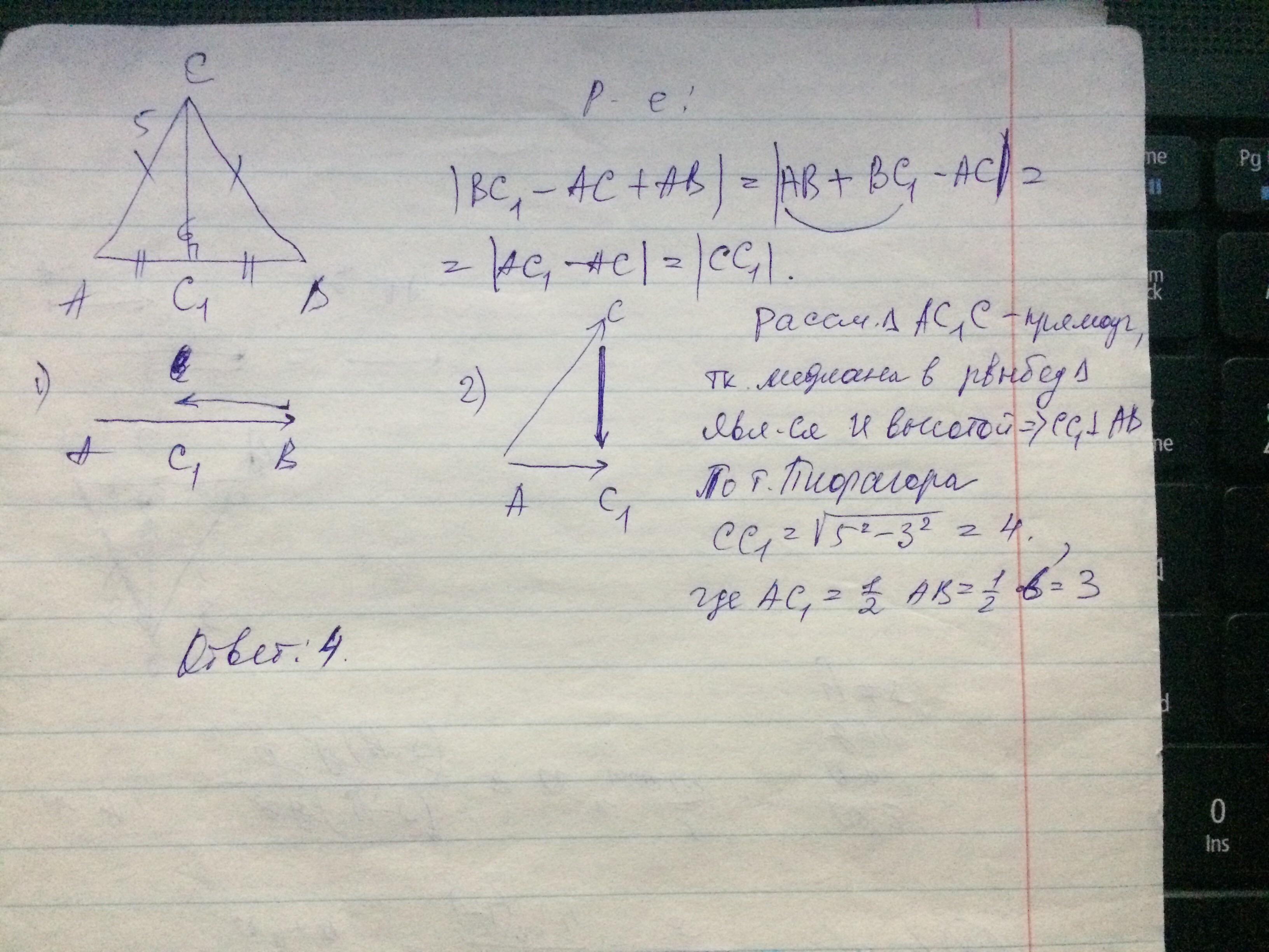 В равнобедренном треугольнике ABC точка C1- середина основания АВ. АВ=6см, АС=5 см. Найдите векторы | ВС1-АС+АВ|