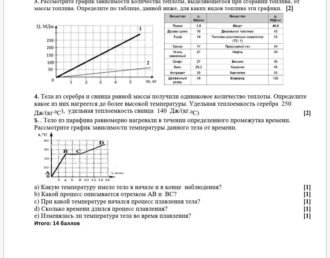 Пожалуйста помогите сор оставшийся Рассмотрите график зависимости количества теплоты, выделяющегося при сгорании топлива, от массы топлива. Определите по таблице, данной ниже, для каких видов топлива эти графики