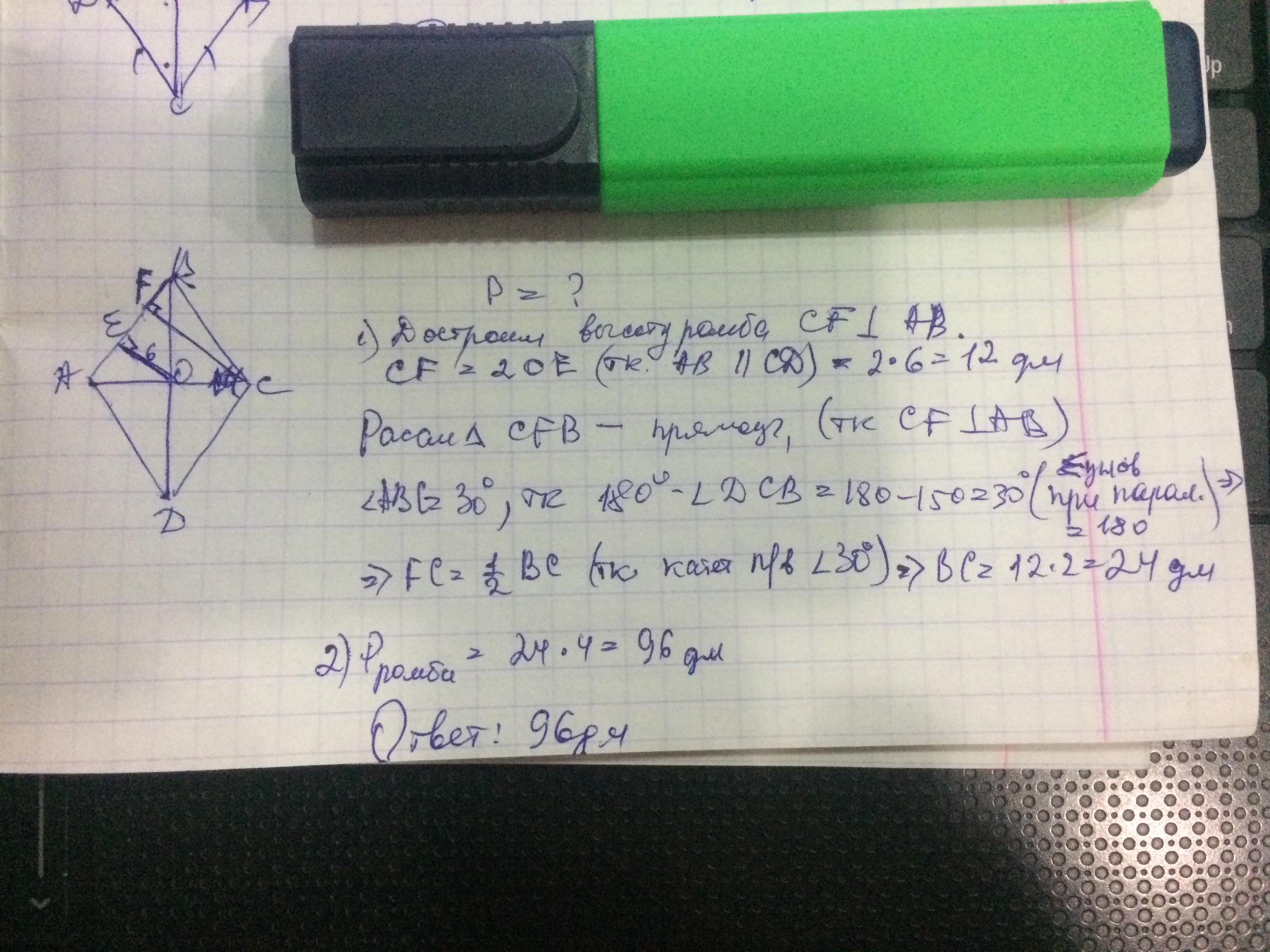 В ромбе с тупым углом 150 градусов расстояние от точки пересечения диагоналей до стороны равно 6 дм. Найти периметр ромба