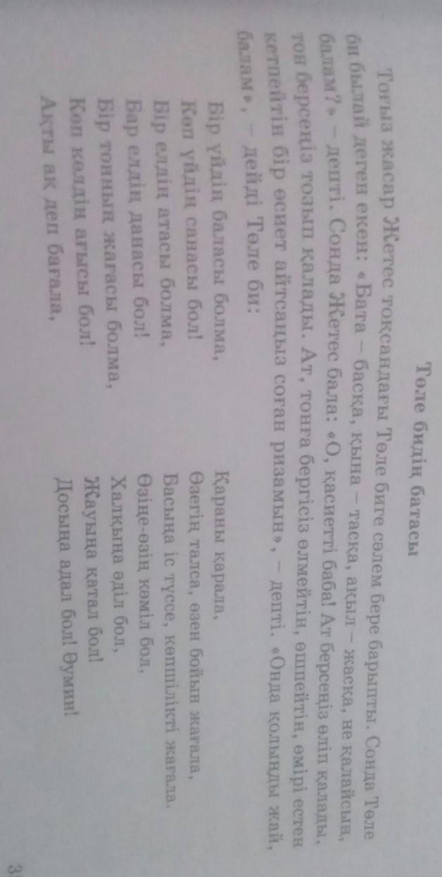 бұл жерде Төле би Жетеске өз еліне адал көптің баласы бол деп айтуда өз жауын қатал ұстап басыңы іс түссе халқыңнан көмек сұра деп айтылған.
