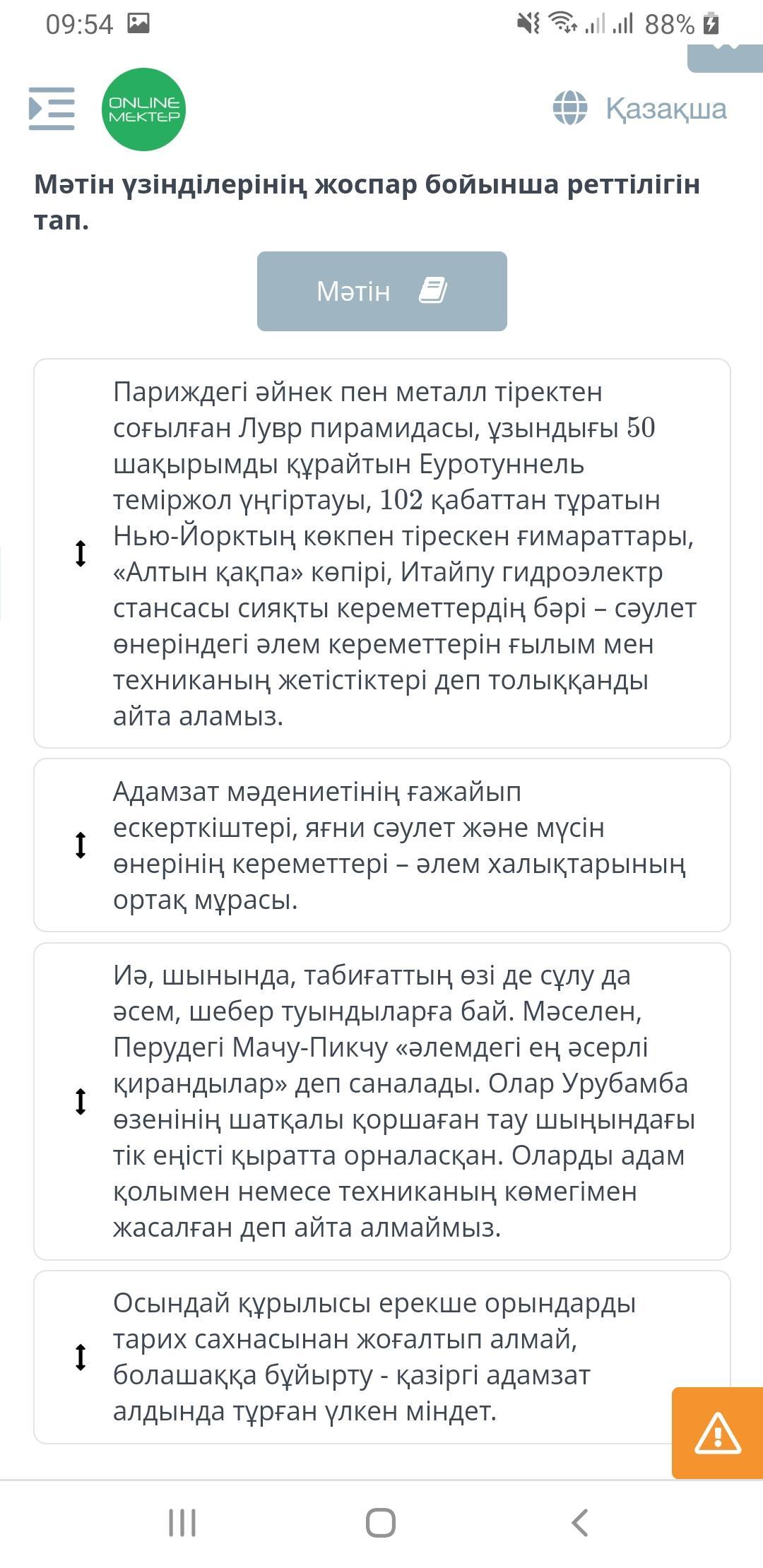 1. Адамзат мәдиетінің ғажайып ескерткіштері, яғни сәулет және мүсін өнерінің кереметтері - әлем халықтарының ортақ мұрасы.