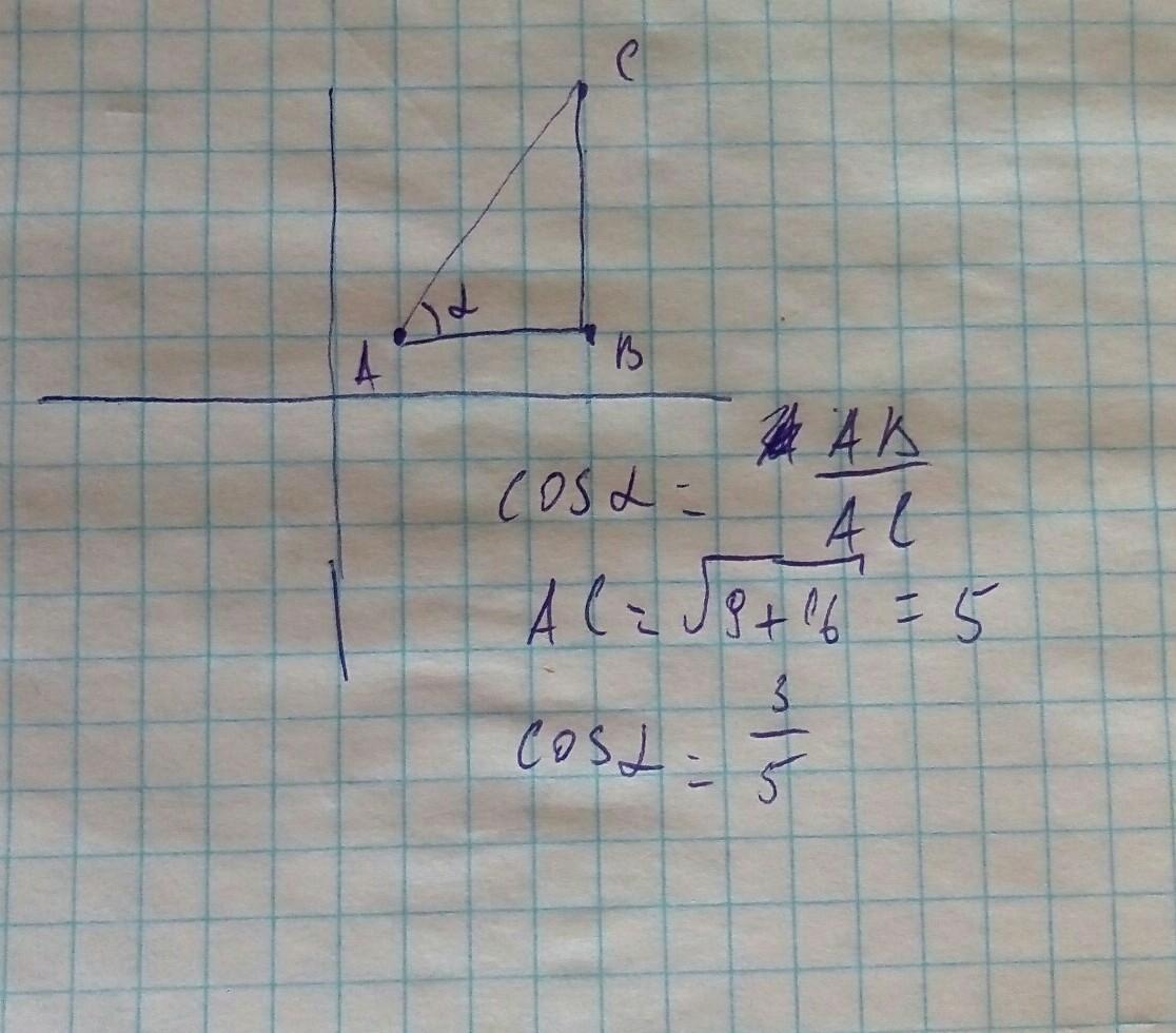 В треугольнике с вершинами в точках А(1;1) В(4;1) С(4;5) определите косинус угла А