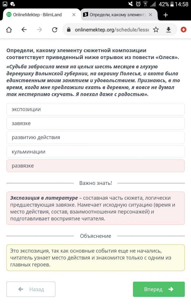 Определи, какому элементу сюжетной композиции соответствует приведенный ниже отрывок из повести «Олеся».