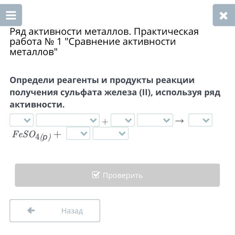 Определи реагенты и продукты реакции получения сульфата железа (ІІ), используя ряд активности.