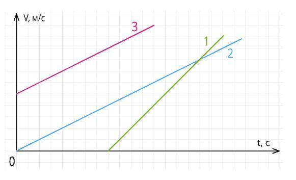 Графики V=5t + 2; V=5t + 8; V=5t все параллельны, ускорения у всех одинаковые, а начальные скорости разные. Поэтому: