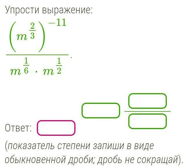 Объяснение:((m²/³)⁻¹¹)/(m¹/⁶*m¹/2)=m⁻²²/³⁻¹/⁶⁻¹/²=m⁽⁻⁴⁴⁻¹⁻³⁾/⁶=m⁻⁴⁸/⁶