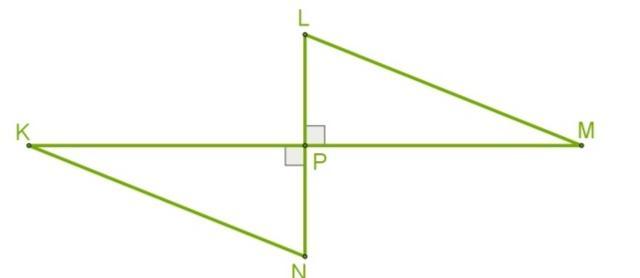 Два перпендикулярных отрезка KM и LN пересекаются в общей серединной точке P и образуют два равных треугольника KPN и MPL.Расстояние между точками K и L равно 30,6 см. Какое расстояние между точками M и N? 1. У равных треугольников все соответствующие элементы равны, стороны KP =__ и NP =__ как соответствующие стороны равных треугольников. ∡ =__ ° и ∡__ = °, так как их смежные углы ∡ KPN = ∡ MPL = °__. По первому признаку треугольник KPL равен треугольнику___ . 2. В равных треугольниках соответствующие стороны равны. Для стороны KL соответствующая сторона — MN.MN=__ = см.