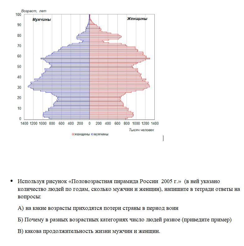 ⦁Используя рисунок «Половозрастная пирамида России 2005 г.» (в ней указано количество людей по годам, сколько мужчин и женщин), напишите в тетради ответы на вопросы: А) на какие возрасты приходятся потери страны в период воин Б) Почему в разных возрастных категориях число людей разное (приведите пример) В) какова продолжительность жизни мужчин и женщин.