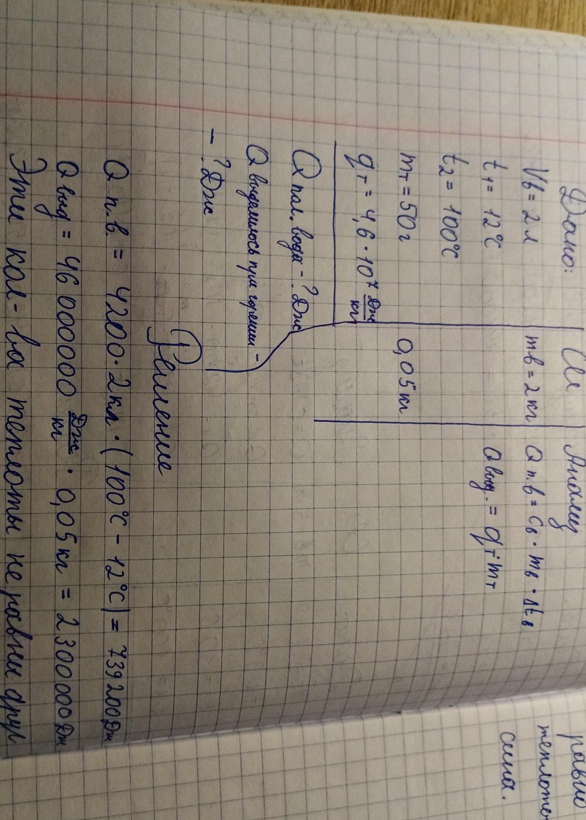 на примусе нагрели 2 л воды от 12 до 100 градусов Цельсия при этом сгорело 50 г керосина Какое количество теплоты получила вода и сколько его выделилось при сгорании керосина Почему не равны друг другу эти количество теплоты какую часть составляет количество теплоты использованная на нагревание воды от количества теплоты выделившегося при сгорании керосина