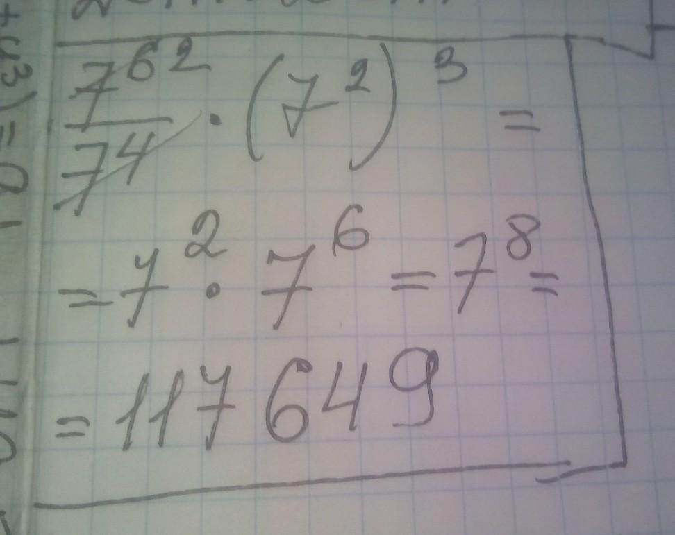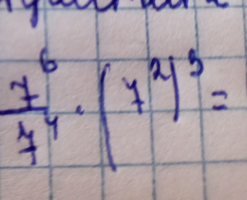 7^6/7^4 •(7^2)^3 = 7^(6-4) • 7^(2•3) = 7^2 • 7^6 = 7^(2+6) = 7^8.