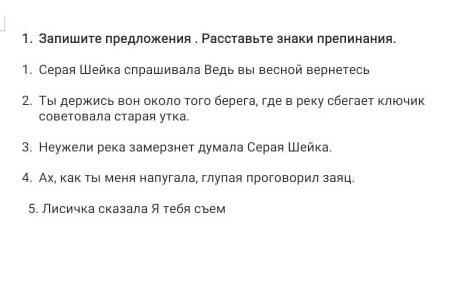 Запишите предложения Расставьте знаки препинания. 1.Серая шейка спрашивала Ведь вы весной вернётесь 2.ты держись вон около того берега
