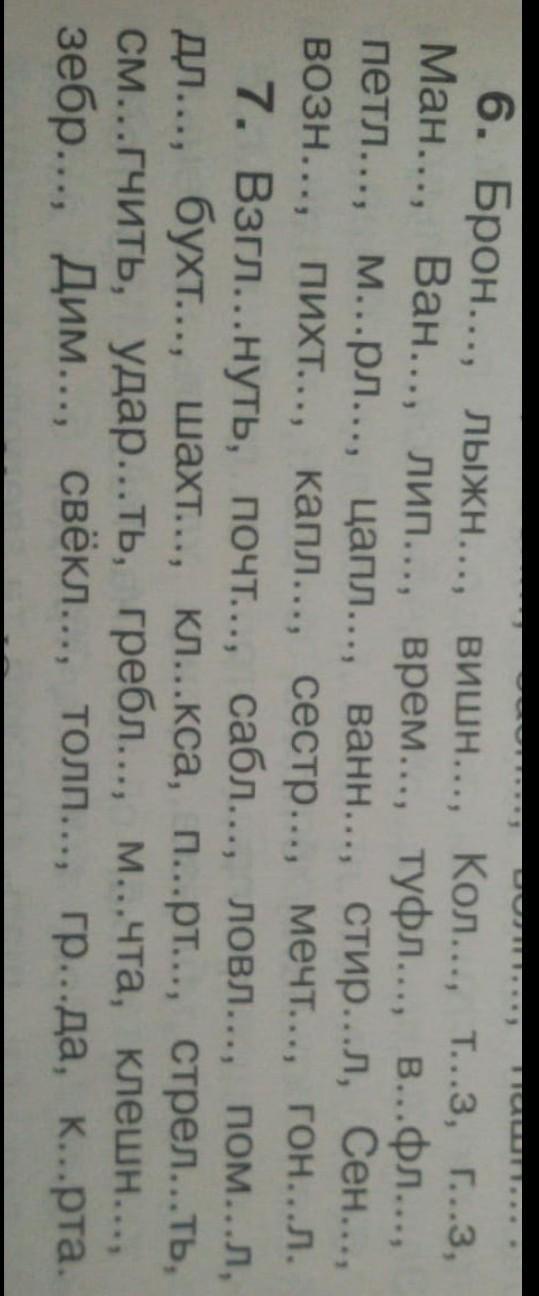 6. Броня, Лыжня, Вишня, Коля, Таз, Газ, Петля, Марля, Цапля, Ванна, Стирал, Сеня, Возня, Пихта, Капля, Сестра, Мечта, Гонял.
