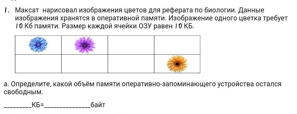 Максат нарисовал изображения цветов для реферата по биологии. Данные изображения хранятся в оперативной памяти. Изображение одного цветка требует 10 Кб памяти. Размер каждой ячейки ОЗУ равен 10 КБ.