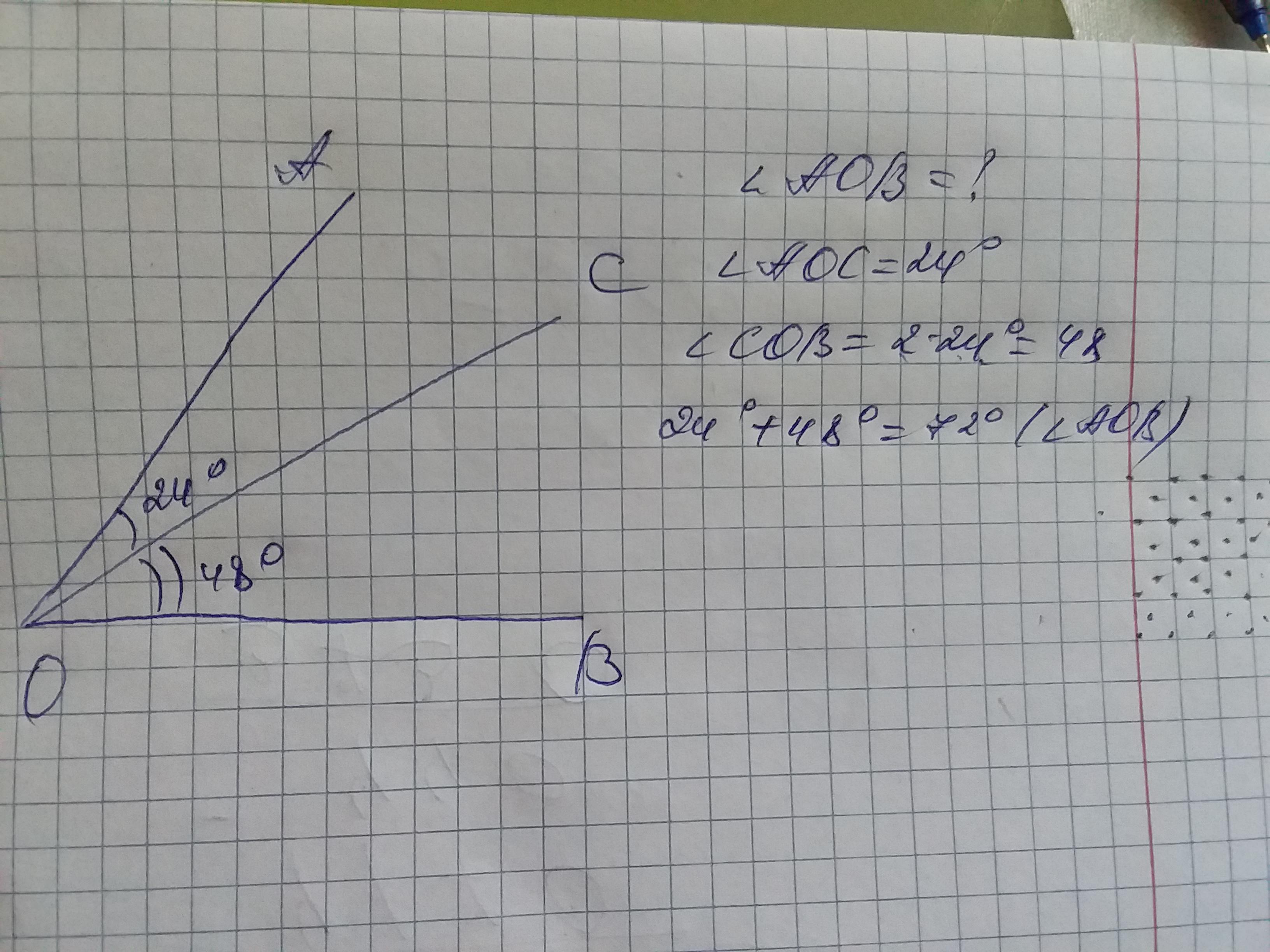 с) найдите величину угла AOB, если AOC - 24, COB в 2 раза больше AOC