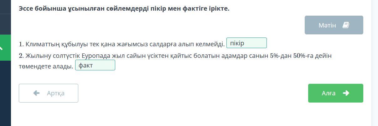 Эссе бойынша ұсынылған сөйлемдерді пікір мен фактіге ірікте. Мәтін 1. Климаттың құбылуы тек қана жағымсыз салдарға алып келмейді. пікір 2. Жылыну солтүстік Еуропада жыл сайын үсіктен қайтыс болатын адамдар санын 5%-дан 50%-ға дейін төмендете алады. факт Артқа Алға