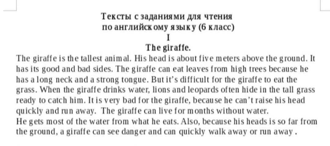 Жираф. Жираф - самая высокая нюхарь аль. Его голова около пяти метров над землей. У этого есть свои хорошие и плохие стороны. Жираф может есть листья от высоких деревьев, потому что у него длинная шея и сильный язык. Но для жирафа трудно есть траву. Когда жираф напитят воду, львы и леопарды из десяти прячущихся в высокой траве, готовой поймать его. Это очень плохо для жирафа, потому что он не может быстро поднять голову и убежать. Жираф может жить в течение нескольких месяцев без воды. Он получает большую часть воды из того, что он ест. Кроме того, потому что его головы настолько далеко от земли, жираф может видеть опасность и может быстро уйти или убежать.