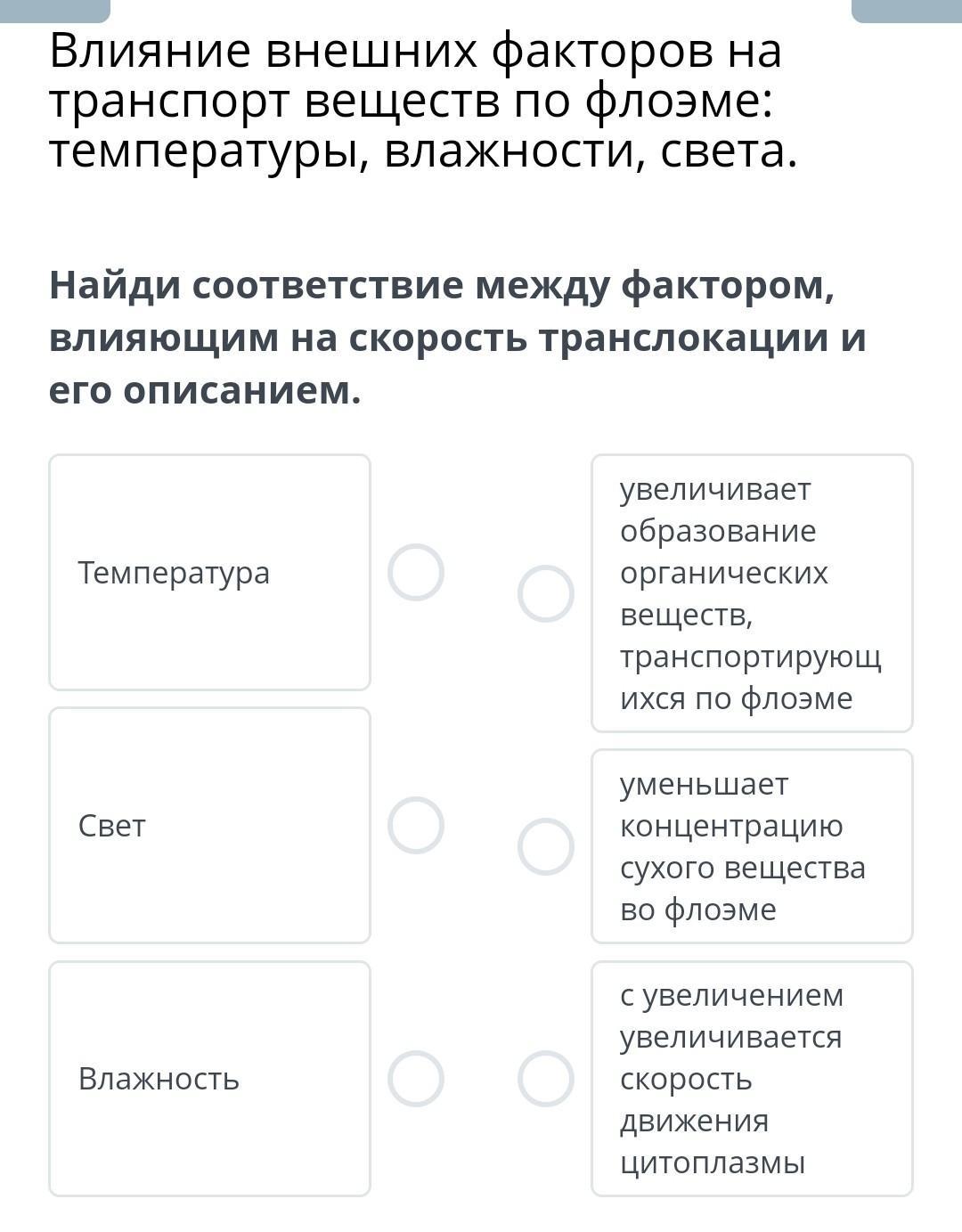 Найди соответствие между фактором, влияющим на скорость транслокации и его описанием.