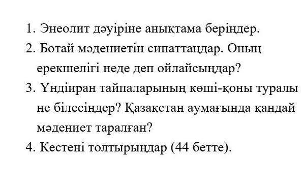 1)Энеолит(лат. aeneus – мыс және гр. lіtos – тас) – неолит пен қола дәуірі аралығындағы археологиялық кезең (тас-мыс кезеңі). Энеолитте тұңғыш рет таза мыс белгілі болды және одан әр түрлі әшекей бұйымдар мен еңбек құралдары жасалды