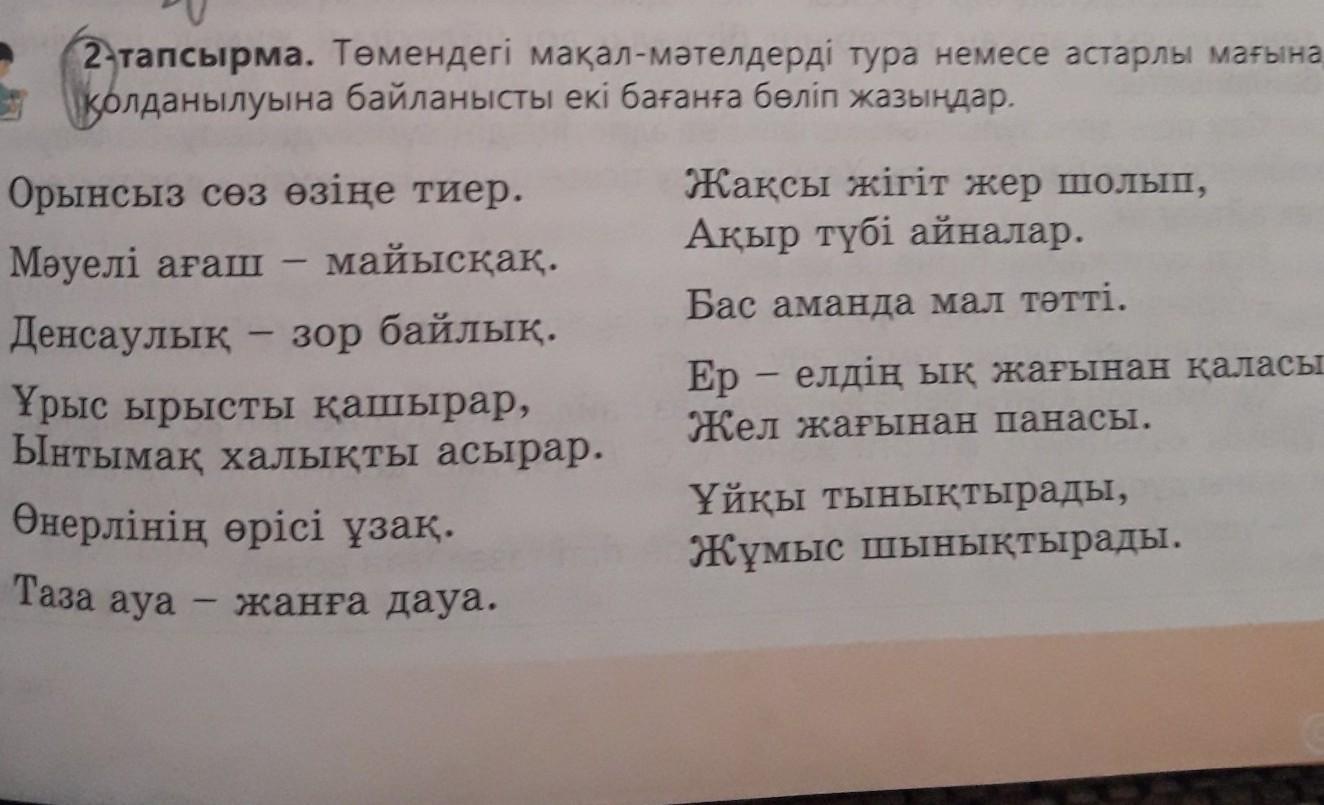 - Көп мағыналы:Орынсыз сөз өзіңе тиер,денсаулық-зор байлық,ұрыс ырысты қашырар,ынтымақ халықты асырар.,өнерлінің өрісі ұзақ,таза ауа-жанға дауа,ұйқы тынықтырады,жұмыс шынықтырады.,ер-елдің ық жағынан қаласы,жел жағынан панасы.,